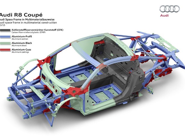 Khung không gian Audi mới với tỷ lệ nhôm và CFRP cao R8 V10 plus * có trọng lượng khô là 1.454 kg (3.205,5 lb) . Yếu tố quan trọng đằng sau thiết...